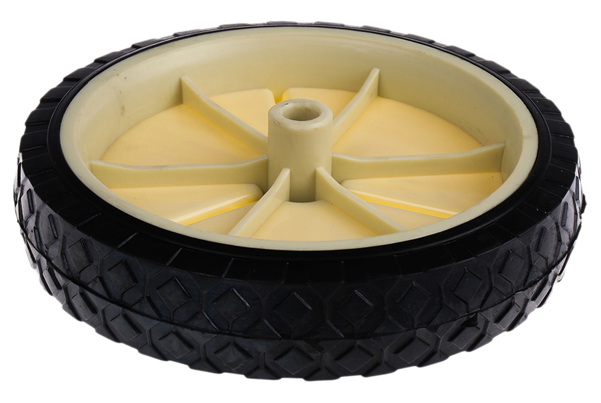 This is Black White Rubber Trolley Wheel 50kg manufactured by Guitel Hervieu. The manufacturer part number is 380076. The tyre of the product is made up of rubber material . Its bore is 43mm in length . It has a decent black, white colour. It can holds up to 50kg load capacity. Moreover, it has solid type tyre . Its hub is made using polypropylene material . The product has a plain bore type hub bearing . It has a wheel about 45mm in width . Its wheel diameter is about 200mm . It contains a standard 12mm bore diameter .