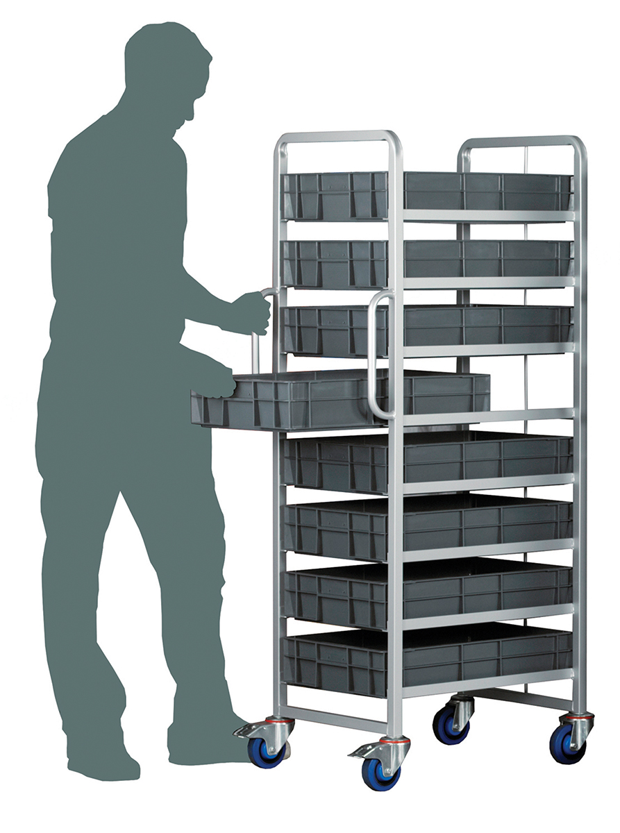 This is 8 Level Steel Drawer Trolley 600 x 400 x 120mm 250kg Load manufactured by RS Pro. The manufacturer part number is 877-6799. The product carries 8 levels. It has a folding feature no . The product is offered with brakes yes . It is created with 2 fixed/2 swivel, braked wheel features . It has about 600mm platform length . Moreover, it has 1500mm of overall height. It has 600 x 400 x 120mm platform dimensions . It can holds up to 250kg load capacity. It is created for medium duty weight class . Its wheel is made up of vulcanised rubber material . It has about 400mm platform width . Its wheel diameter is about 100mm . Its frame is made using steel material . It comes in drawer configuration. It has a rubber type wheel .