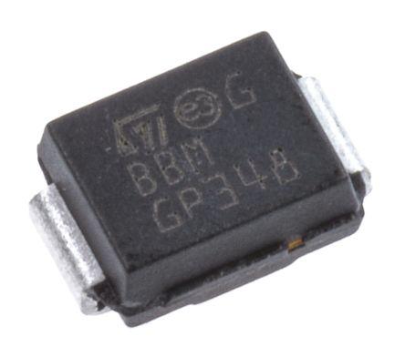 This is Bi-Directional TVS Diode 600W 2-Pin SMB manufactured by STMicroelectronics. The manufacturer part number is SMBJ30CA. It also has 62a maximum peak pulse current. The given dimensions of the product include 4.6 x 3.95 x 2.45mm. The product is available in surface mount configuration. While is configured as bi-directional. The product has a maximum 0.2µa of reverse leakage current. It harbours a 33.3v of minimum breakdown voltage. It has 600w of peak pulse power dissipation. In addition, the height is 2.45mm. Furthermore, the product is 3.95mm wide. Its accurate length is 4.6mm. While the maximised reverse stand-off voltage includes 30v. The package is a sort of smb. It consists of 1 elements per chip. Whereas, the minimum operating temperature of the product is -55 °c. It is supplied with 64.3v of maximum clamping voltage. It has a maximum operating temperature of +150 °c. It contains 2 pins. In addition, it has 1ma test current.