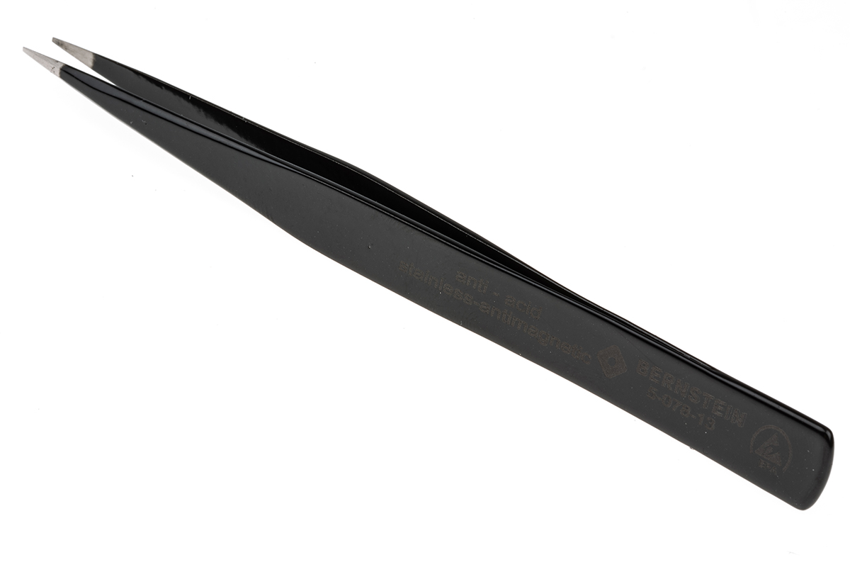 This is 130 mm Anti-Magnetic Stainless Steel Chisel Tweezers ESD Anti-Acid manufactured by Bernstein. The manufacturer part number is 5-078-13. The product is made from highly stable and reliable stainless steel. ESD Safety - yes. In addition, it is anti-acid yes . It has an anti-magnetic characteristic yes . It has an overall length of 130 mm. It has a/an chisel type point .