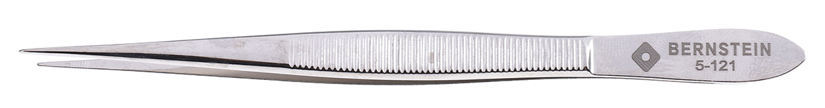 This is 120 mm Nickel Plated Steel Straight; Narrow Pointed; Serrated Tweezers manufactured by Bernstein. The manufacturer part number is 5-121. The product is made from highly stable and reliable nickel plated steel. It has a/an narrow pointed; serrated type point . The product has a straight orientation. It has an overall length of 120 mm.