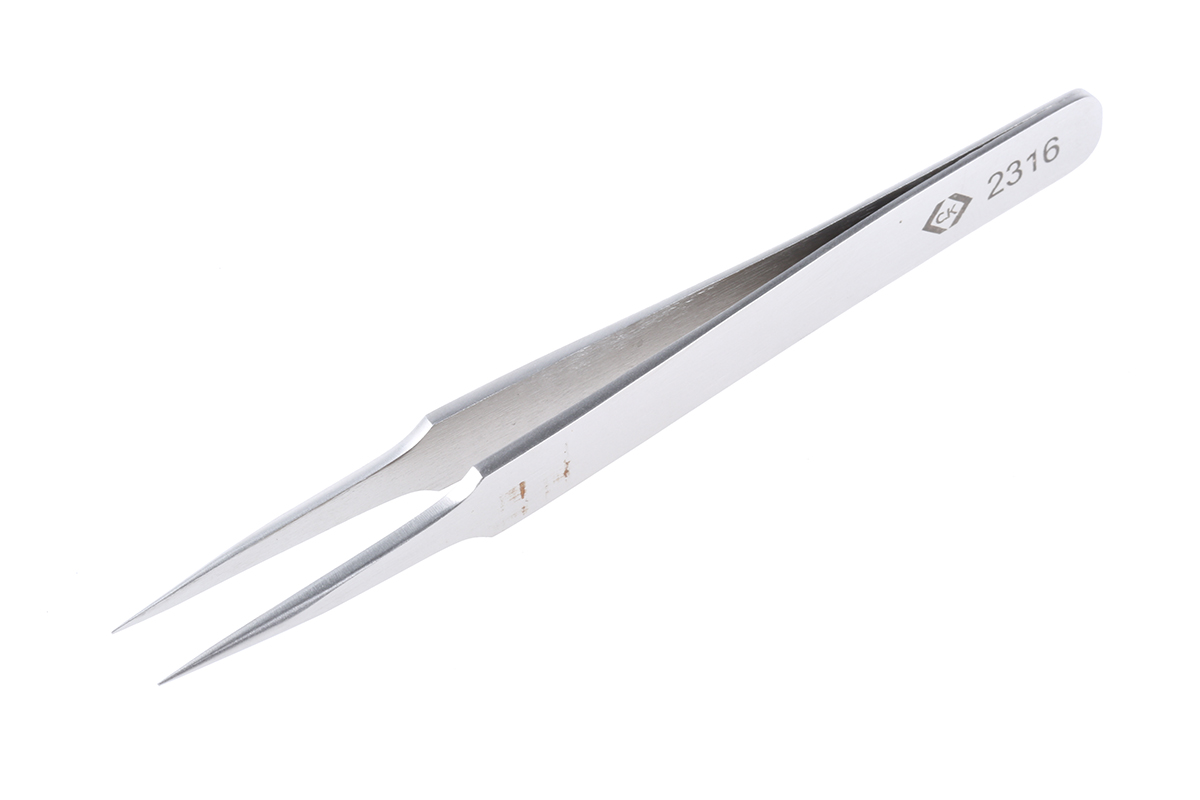 This is 105 mm Anti-Magnetic Stainless Steel Fine; Straight Tweezers Anti-Acid manufactured by CK. The manufacturer part number is T2316. The tip is fine in size. The product has a straight orientation. The product is made from highly stable and reliable stainless steel. In addition, it is anti-acid yes . It has an anti-magnetic characteristic yes . It has an overall length of 105 mm.