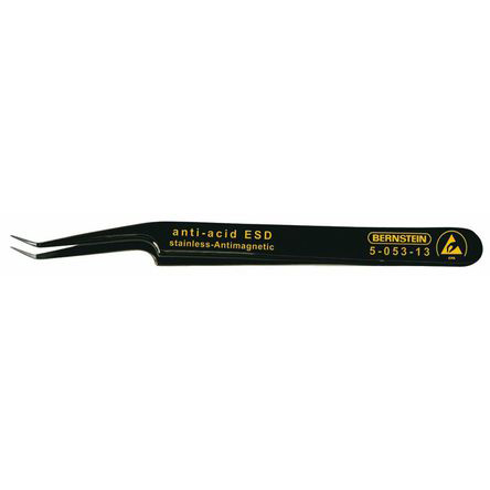 This is 110 mm Anti-Magnetic Stainless Steel Oblique Tweezers ESD Anti-Acid Solder Resistant manufactured by Bernstein. The manufacturer part number is 5-053-13. It has a solder adhesion resistant feature yes . The product is made from highly stable and reliable stainless steel. ESD Safety - yes. In addition, it is anti-acid yes . It has an anti-magnetic characteristic yes . It has an overall length of 110 mm. It has a/an oblique type point .