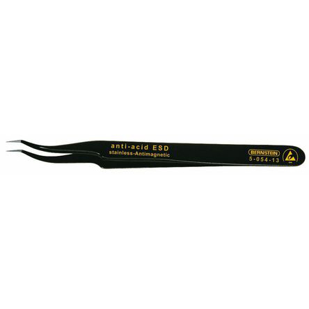 This is 120 mm Anti-Magnetic Stainless Steel Sickle; Curved; Pointed ESD Anti-Acid Solder Resistant Tweezers manufactured by Bernstein. The manufacturer part number is 5-054-13. It has a solder adhesion resistant feature yes . The product has a curved orientation. The product is made from highly stable and reliable stainless steel. It has an overall length of 120 mm. In addition, it is anti-acid yes . It has an anti-magnetic characteristic yes . ESD Safety - yes. It has a/an sickle; pointed type point .