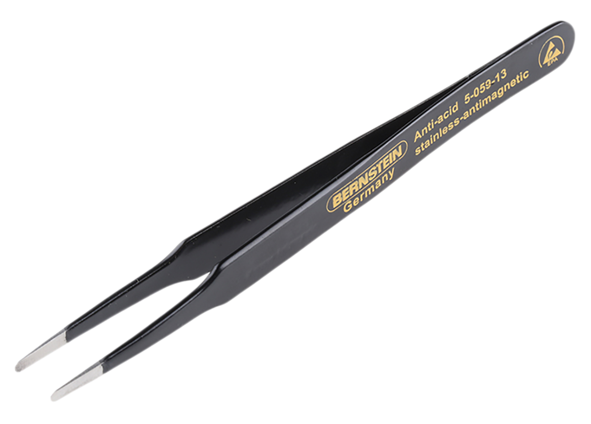 This is 120 mm Anti-Magnetic Stainless Steel Flat; Rounded Tweezers ESD Anti-Acid manufactured by Bernstein. The manufacturer part number is 5-059-13. The product is made from highly stable and reliable stainless steel. ESD Safety - yes. In addition, it is anti-acid yes . It has an anti-magnetic characteristic yes . It has an overall length of 120 mm. It has a/an flat; rounded type point .