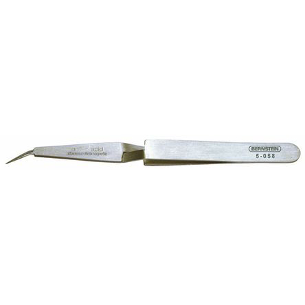 This is 120 mm Anti-Magnetic Stainless Steel Bent; Pointed Tweezers Anti-Acid manufactured by Bernstein. The manufacturer part number is 5-058. The product has a bent orientation. The product is made from highly stable and reliable stainless steel. In addition, it is anti-acid yes . It has an anti-magnetic characteristic yes . It has an overall length of 120 mm. It has a/an pointed type point .