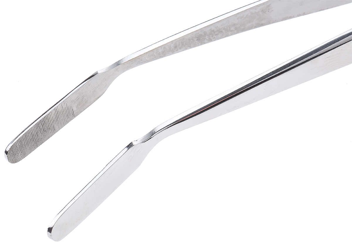 This is 150 mm Stainless Steel Fine; Flat Nose; Serrated Tweezers manufactured by RS Pro. The manufacturer part number is 547-694. The tip is fine in size. The product is made from highly stable and reliable stainless steel. It has a/an flat; serrated type point . The product has a bent orientation. It has an overall length of 150 mm.