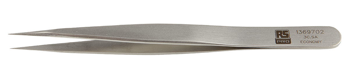 This is 110 mm Anti-Magnetic Stainless Steel Anti-Acid Tweezers manufactured by RS Pro. The manufacturer part number is 136-9702. The product is made from highly stable and reliable stainless steel. In addition, it is anti-acid yes . It has an anti-magnetic characteristic yes . It has a model number 3c.sa. It has an overall length of 110 mm.