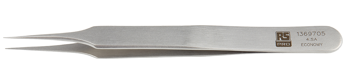 This is 110 mm Anti-Magnetic Stainless Steel Fine Anti-Acid Tweezers manufactured by RS Pro. The manufacturer part number is 136-9705. The tip is fine in size. The product is made from highly stable and reliable stainless steel. It has a model number 4.sa.b. In addition, it is anti-acid yes . It has an anti-magnetic characteristic yes . It has an overall length of 110 mm.