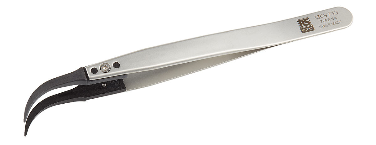 This is 130 mm Anti-Magnetic Stainless Steel Fine; Curved ESD Anti-Acid Tweezers manufactured by RS Pro. The manufacturer part number is 136-9733. The tip is fine in size. The product has a curved orientation. The product is made from highly stable and reliable stainless steel. It has an overall length of 130 mm. It has a model number 7cfr.sa. In addition, it is anti-acid yes . It has an anti-magnetic characteristic yes . ESD Safety - yes.