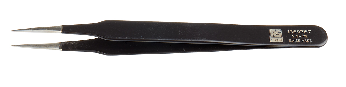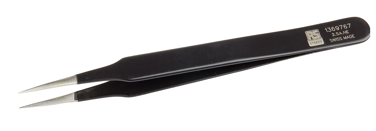 This is 120 mm Anti-Magnetic Stainless Steel ESD Anti-Acid Tweezers manufactured by RS Pro. The manufacturer part number is 136-9767. The product is made from highly stable and reliable stainless steel. In addition, it is anti-acid yes . It has an overall length of 120 mm. It has an anti-magnetic characteristic yes . ESD Safety - yes.