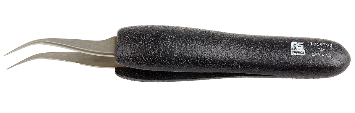 This is 120 mm Anti-Magnetic Stainless Steel Curved Fine ESD Anti-Acid Tweezers manufactured by RS Pro. The manufacturer part number is 136-9793. The tip is fine in size. The product has a curved orientation. The product is made from highly stable and reliable stainless steel. It has an overall length of 120 mm. It has a model number 7.sa.dn. In addition, it is anti-acid yes . It has an anti-magnetic characteristic yes . ESD Safety - yes.