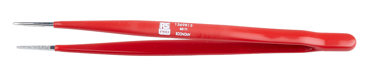 This is 155 mm Carbon Steel Fine; Serrated; Bent Tweezers manufactured by RS Pro. The manufacturer part number is 136-9813. The tip is fine in size. The product has a bent orientation. The product is made from highly stable and reliable carbon steel. In addition, it is anti-acid no . It has an anti-magnetic characteristic no . It has an overall length of 155 mm. It has a/an serrated type point .