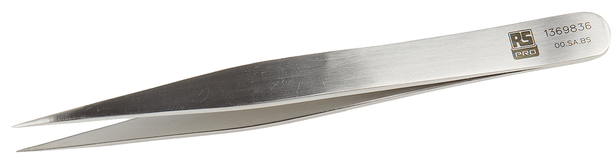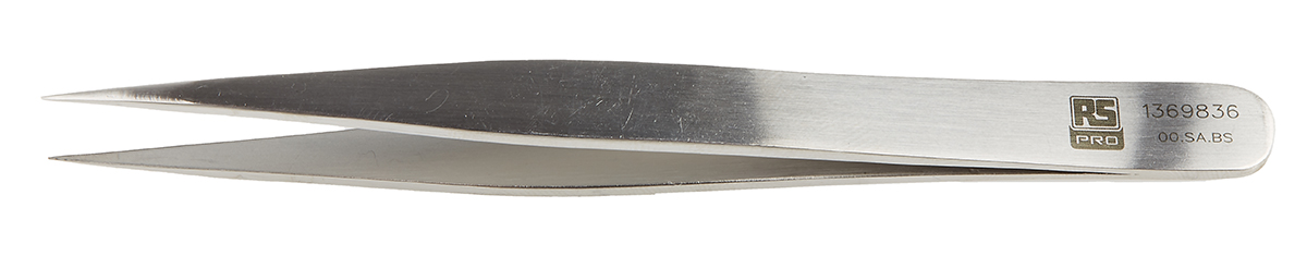 This is 120 mm Anti-Magnetic Stainless Steel Flat Anti-Acid Tweezers manufactured by RS Pro. The manufacturer part number is 136-9836. The product is made from highly stable and reliable stainless steel. It has a model number 00.sa.b. In addition, it is anti-acid yes . It has an anti-magnetic characteristic yes . It has an overall length of 120 mm. It has a/an flat type point .