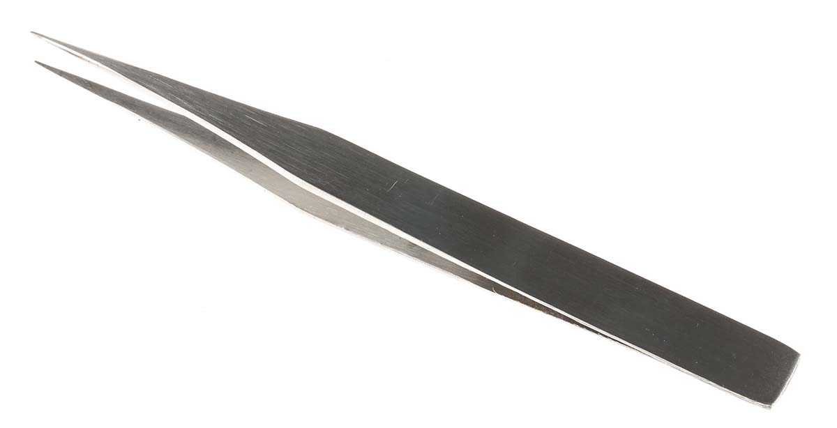 This is 130 mm Anti-Magnetic Stainless Steel Straight Fine Anti-Acid Tweezers manufactured by RS Pro. The manufacturer part number is 136-9850. The tip is fine in size. The product has a straight orientation. The product is made from highly stable and reliable stainless steel. It has a model number aa.sa. In addition, it is anti-acid yes . It has an anti-magnetic characteristic yes . It has an overall length of 130 mm.
