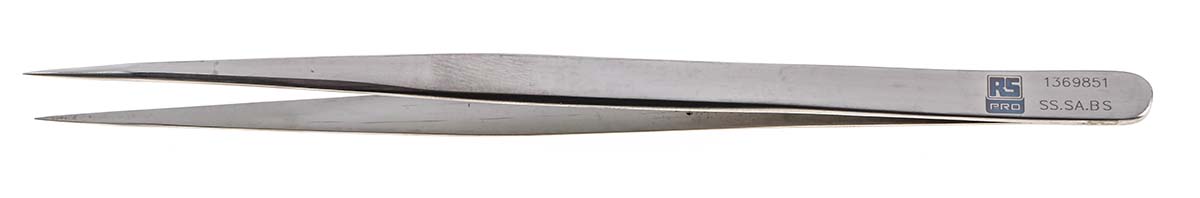 This is 140 mm Anti-Magnetic Stainless Steel Fine Anti-Acid Tweezers manufactured by RS Pro. The manufacturer part number is 136-9851. The tip is fine in size. The product is made from highly stable and reliable stainless steel. It has a model number ss.sa.b. In addition, it is anti-acid yes . It has an anti-magnetic characteristic yes . It has an overall length of 140 mm.