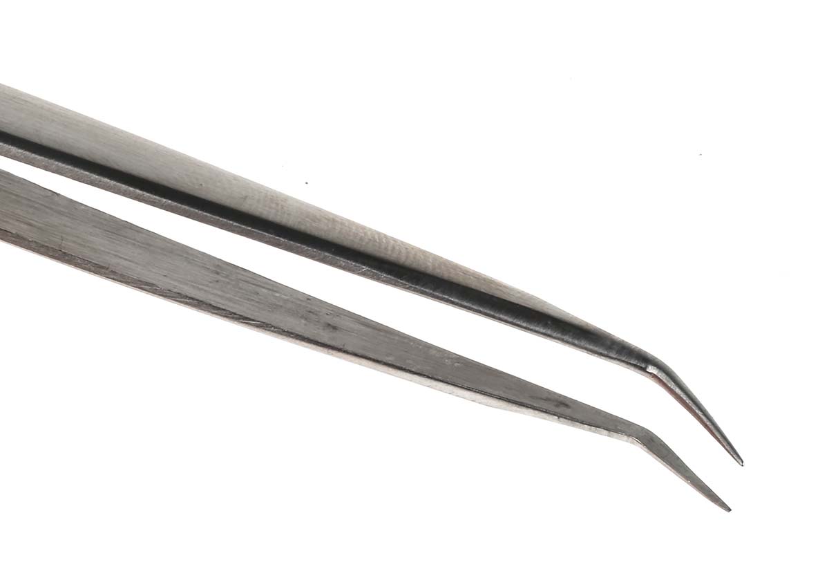This is 140 mm Stainless Steel Extra Fine; Curved; Needle Tweezers manufactured by RS Pro. The manufacturer part number is 549-634. The tip is extra fine in size. The product is made from highly stable and reliable stainless steel. The product has a curved orientation. It has an overall length of 140 mm.