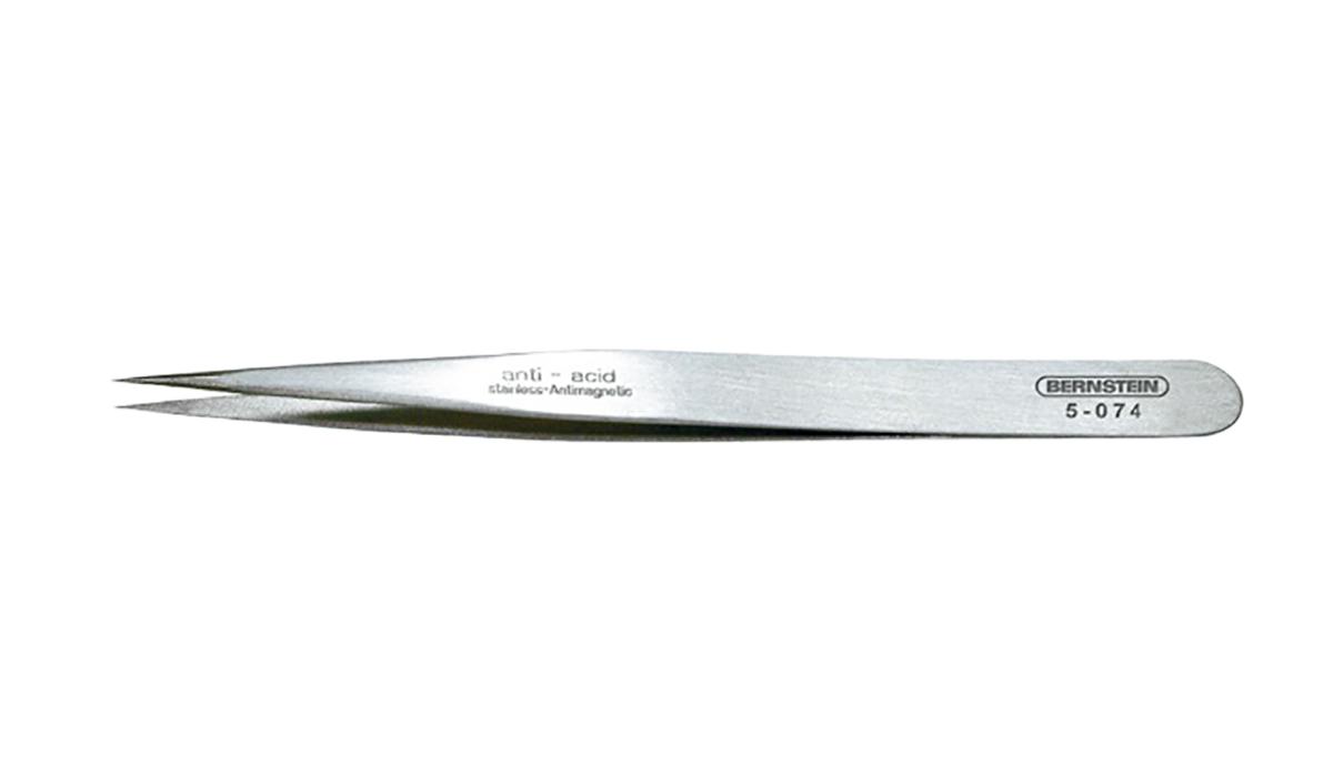 This is Tools for electronics 120 mm Anti-Magnetic Stainless Steel Straight; Pointed Anti-Acid manufactured by Bernstein. The manufacturer part number is 5-074. It has a solder adhesion resistant feature yes . The product has a straight orientation. The product is made from highly stable and reliable stainless steel. In addition, it is anti-acid yes . It has an anti-magnetic characteristic yes . It has an overall length of 120 mm. It has a/an pointed type point .