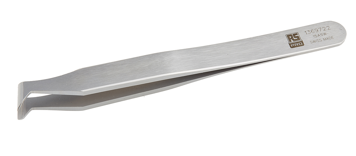 This is 120 mm Carbon Steel Bent Tweezers manufactured by RS Pro. The manufacturer part number is 136-9722. The product is made from highly stable and reliable carbon steel. The product has a bent orientation. It has a model number 15asw.c. It has an overall length of 120 mm.