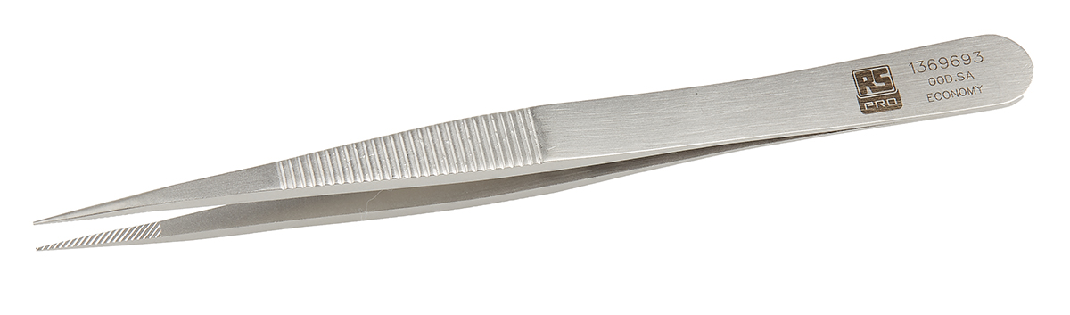 This is 120 mm Anti-Magnetic Stainless Steel Serrated Anti-Acid Tweezers manufactured by RS Pro. The manufacturer part number is 136-9693. The product is made from highly stable and reliable stainless steel. It has a model number 00d.sa. In addition, it is anti-acid yes . It has an anti-magnetic characteristic yes . It has an overall length of 120 mm. It has a/an serrated type point .