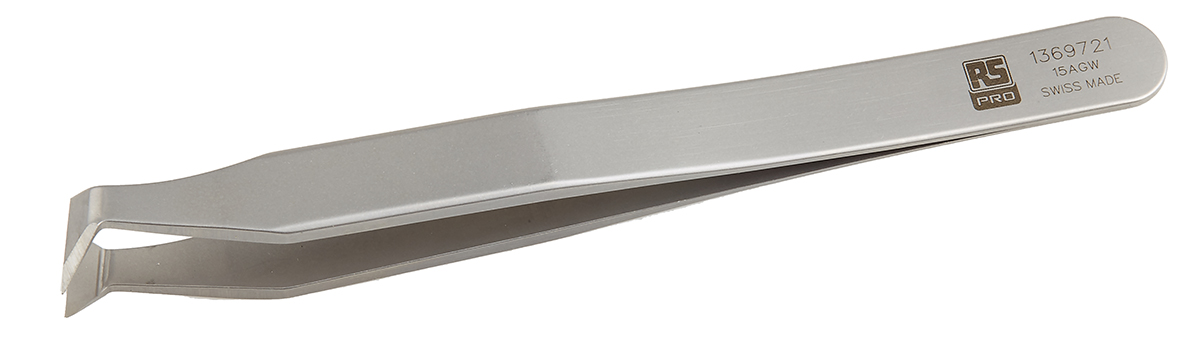 This is 120 mm Carbon Steel Bent Tweezers manufactured by RS Pro. The manufacturer part number is 136-9721. The product is made from highly stable and reliable carbon steel. The product has a bent orientation. It has a model number 15agw.c. It has an overall length of 115 mm.
