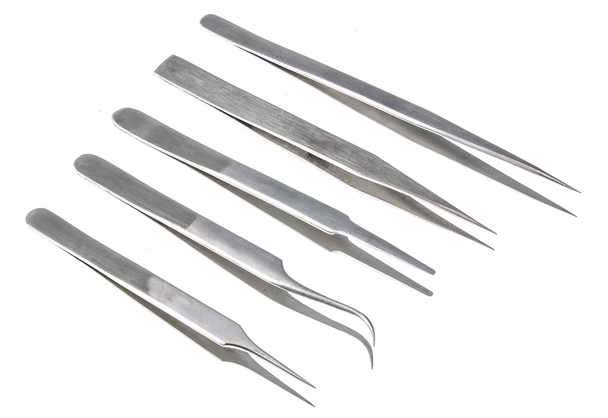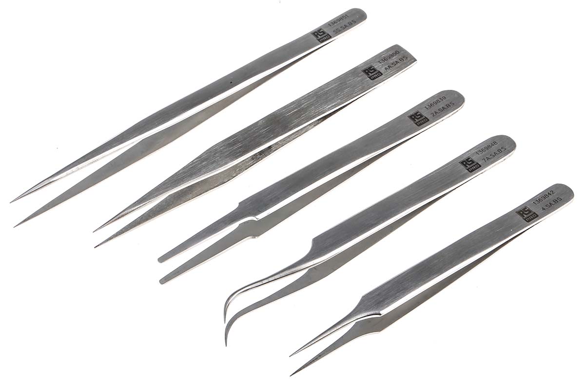 This is 5 piece Stainless Steel Tweezer Set with Various Contents manufactured by RS Pro. The manufacturer part number is 136-9872. The product is made from highly stable and reliable stainless steel. The product consists of 5 pieces.
