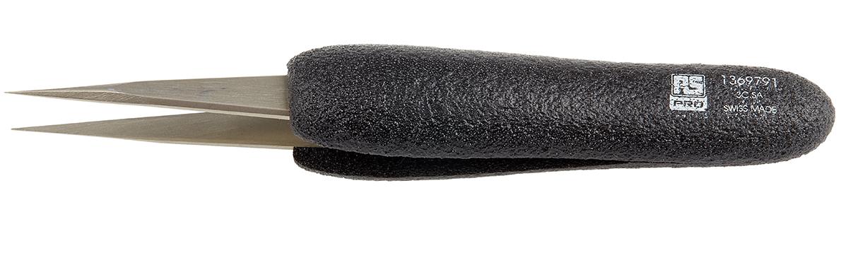 This is 115 mm Anti-Magnetic Stainless Steel Sharp ESD Anti-Acid Tweezers manufactured by RS Pro. The manufacturer part number is 136-9791. The product is made from highly stable and reliable stainless steel. It has an overall length of 115 mm. It has a model number 3c.sa.dn. In addition, it is anti-acid yes . It has an anti-magnetic characteristic yes . ESD Safety - yes. It has a/an sharp type point .