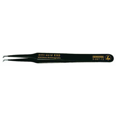 This is 120 mm Anti-Magnetic Stainless Steel Bent ESD Anti-Acid Tweezers manufactured by Bernstein Tools for electronics. The manufacturer part number is 5-067-13. The product is made from highly stable and reliable stainless steel. ESD Safety - yes. In addition, it is anti-acid yes . It has an anti-magnetic characteristic yes . It has an overall length of 120 mm. It has a/an bent type point .