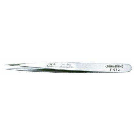 This is 110 mm Anti-Magnetic Stainless Steel Straight; Pointed Anti-Acid manufactured by Bernstein Tools for electronics. The manufacturer part number is 5-072. It has a solder adhesion resistant feature yes . The product is made from highly stable and reliable stainless steel. In addition, it is anti-acid yes . It has an anti-magnetic characteristic yes . It has an overall length of 110 mm. It has a/an straight; pointed type point .