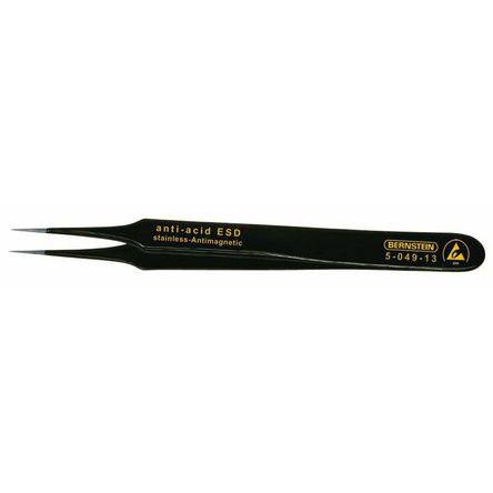 This is 110 mm Anti-Magnetic Stainless Steel Straight; Pointed ESD Anti-Acid Tweezers manufactured by Bernstein Tools for electronics. The manufacturer part number is 5-049-13. The product is made from highly stable and reliable stainless steel. ESD Safety - yes. In addition, it is anti-acid yes . It has an anti-magnetic characteristic yes . It has an overall length of 110 mm. It has a/an straight; pointed type point .