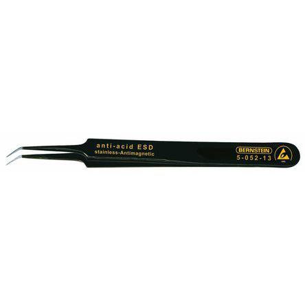 This is 110 mm Anti-Magnetic Stainless Steel Bent; Pointed ESD Anti-Acid manufactured by Bernstein Tools for electronics. The manufacturer part number is 5-052-13. It has a solder adhesion resistant feature yes . The product is made from highly stable and reliable stainless steel. ESD Safety - yes. In addition, it is anti-acid yes . It has an anti-magnetic characteristic yes . It has an overall length of 110 mm. It has a/an bent; pointed type point .