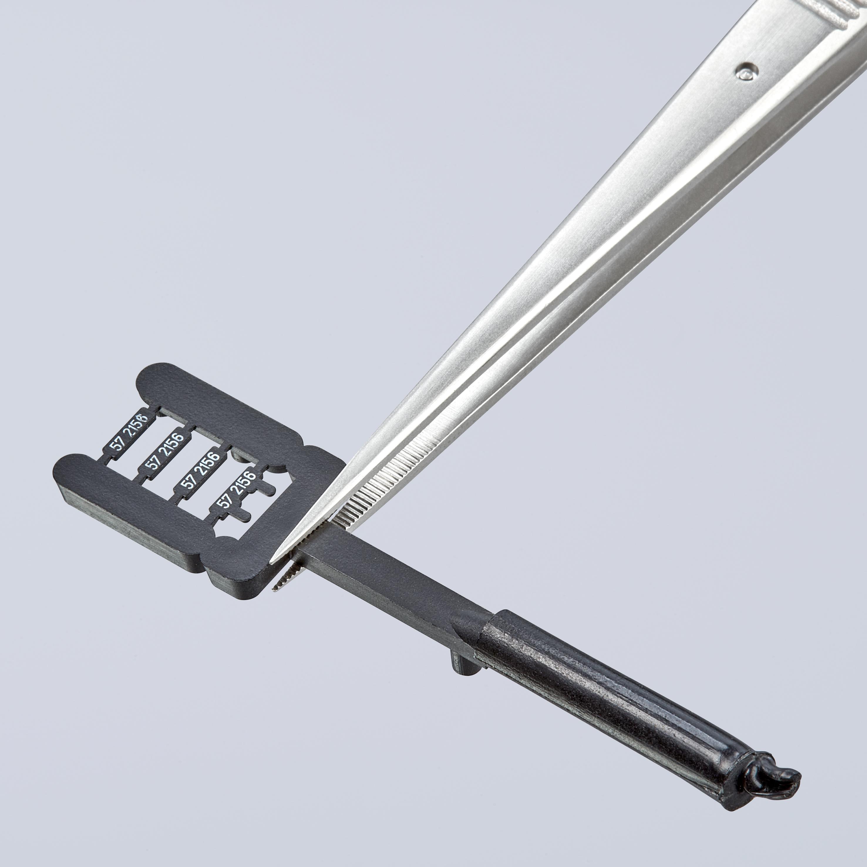 This is 155 mm Anti-Magnetic Stainless Steel Anti-Acid Tweezers manufactured by Knipex. The manufacturer part number is 92 22 35. The tip is pointed in size. The product has a straight orientation. The product is made from highly stable and reliable stainless steel. It has an overall length of 155 mm. In addition, it is anti-acid yes . It has an anti-magnetic characteristic yes . ESD Safety - no. It has a/an serrated type point . The product consists of 1 pieces.
