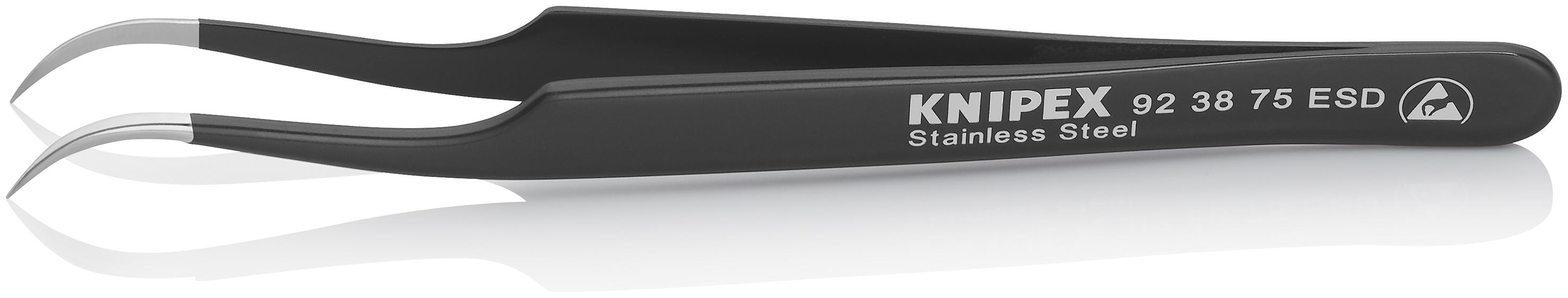 This is 120 mm Anti-Magnetic Stainless Steel Bent ESD Tweezers manufactured by Knipex. The manufacturer part number is 92 38 75 ESD. The tip is ultra-fine in size. The product has a angled orientation. The product is made from highly stable and reliable stainless steel. It has an overall length of 120 mm. In addition, it is anti-acid yes . It has an anti-magnetic characteristic yes . ESD Safety - yes. It has a/an smooth type point . The product consists of 1 pieces.