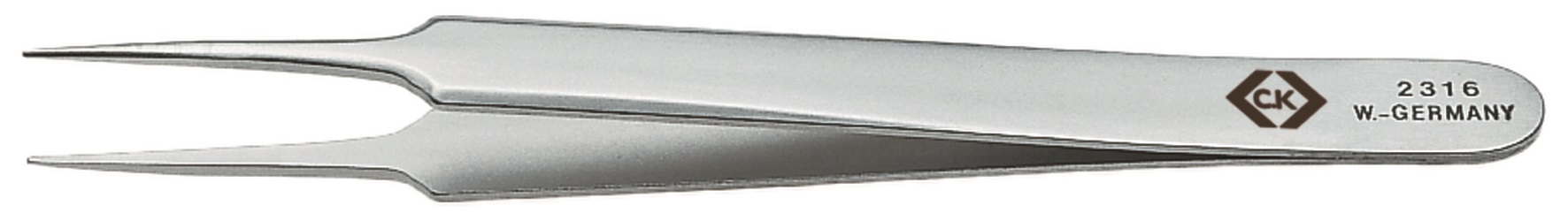 This is 115 mm Stainless Steel ESD Tweezers manufactured by EUROSTAT. The manufacturer part number is 45-015-1464. It has an overall length of 115 mm. The product is made from highly stable and reliable stainless steel. It has an anti-magnetic characteristic yes . It has a model number 45-015. ESD Safety - yes.