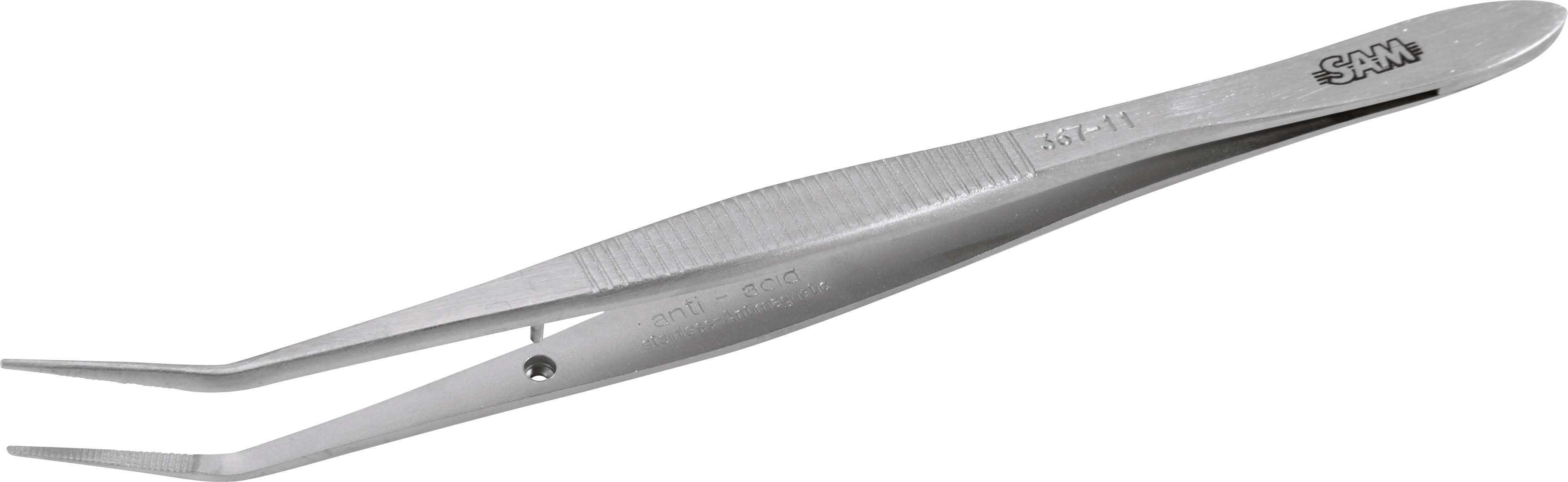 This is 135 mm Stainless Steel Tweezers manufactured by SAM. The manufacturer part number is 367-11. The product is made from highly stable and reliable stainless steel. It has an anti-magnetic characteristic yes . It has a model number 367-11. It has an overall length of 135 mm.