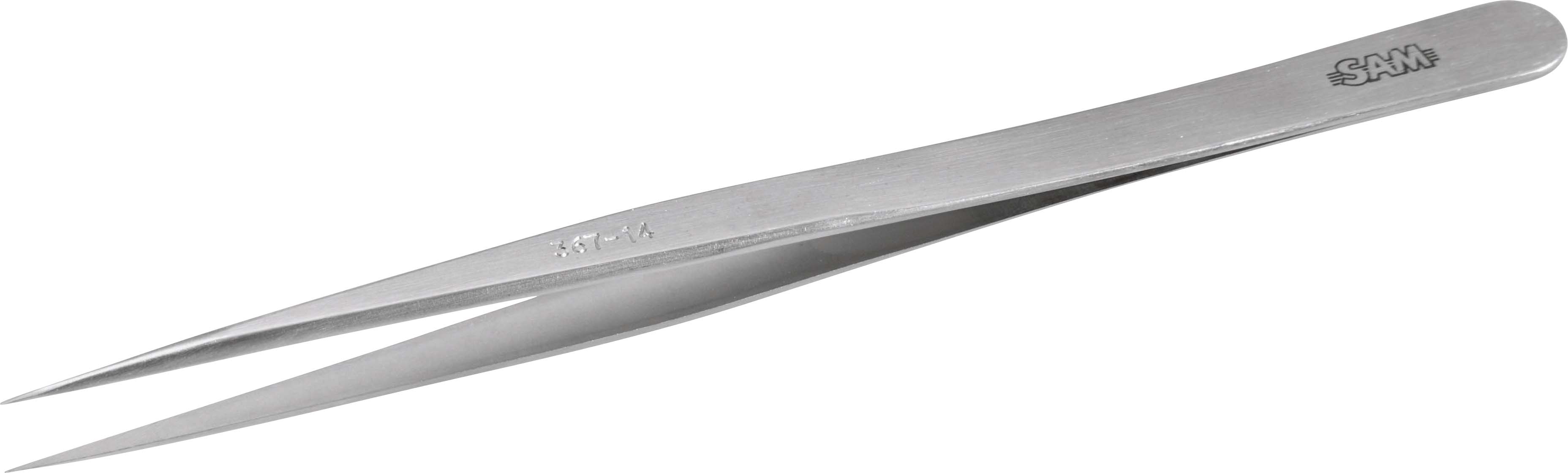 This is 140 mm Stainless Steel Tweezers manufactured by SAM. The manufacturer part number is 367-14. The product is made from highly stable and reliable stainless steel. It has an anti-magnetic characteristic yes . It has a model number 367-14. It has an overall length of 140 mm.