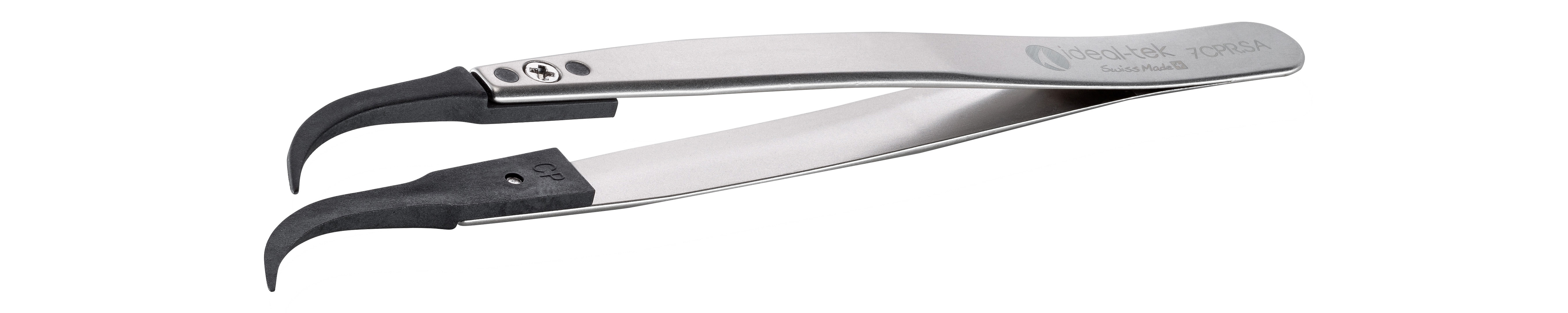 This is 130 mm PEEK (Tip) Stainless Steel (Body) Curved Fine ESD Tweezers manufactured by ideal-tek. The manufacturer part number is 7CPR.SA.1. The tip is fine in size. The product has a curved orientation. The product is made from highly stable and reliable peek (tip), stainless steel (body). It has an overall length of 130 mm. It has a model number 7cpr.sa. In addition, it is anti-acid yes . It has an anti-magnetic characteristic yes . ESD Safety - yes.
