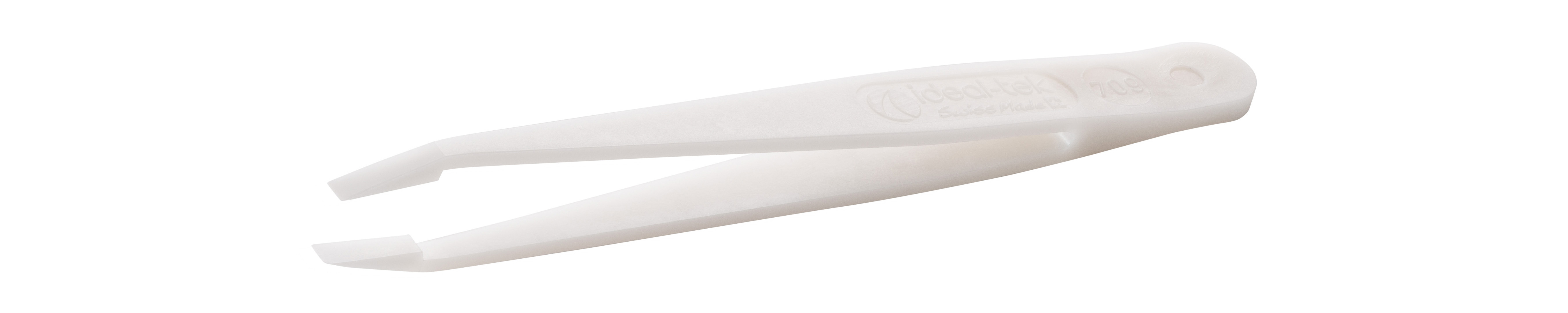 This is 115 mm Delrin Plastic Fine; Flat Tweezers manufactured by ideal-tek. The manufacturer part number is 709.DG.ITR. The tip is fine in size. The product is made from highly stable and reliable delrin plastic. It has an anti-magnetic characteristic yes . It has an overall length of 115 mm. It has a/an flat type point .