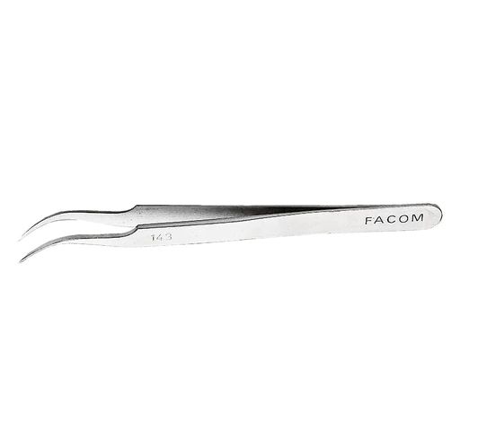 This is 114 mm Curved Tweezer manufactured by Facom. The manufacturer part number is 143. The product has a curved orientation. It has an overall length of 114 mm.