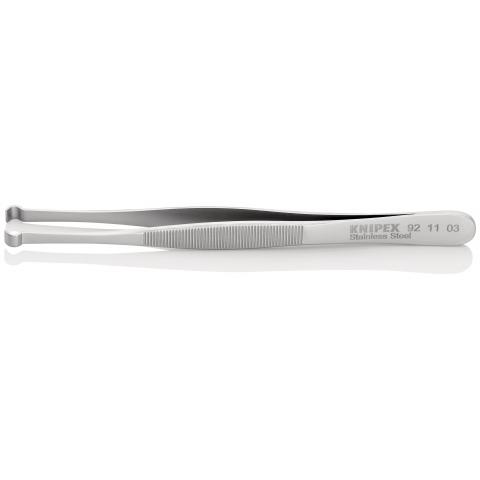 This is 122 mm Stainless Steel Straight Tweezer manufactured by Knipex. The manufacturer part number is 92 11 03. The tip is smd in size. The product has a straight orientation. The product is made from highly stable and reliable stainless steel. It has an overall length of 122 mm. It has a model number 92 11 03. In addition, it is anti-acid yes . It has an anti-magnetic characteristic yes . ESD Safety - no. It has a/an smooth type point . The product consists of 1 pieces.