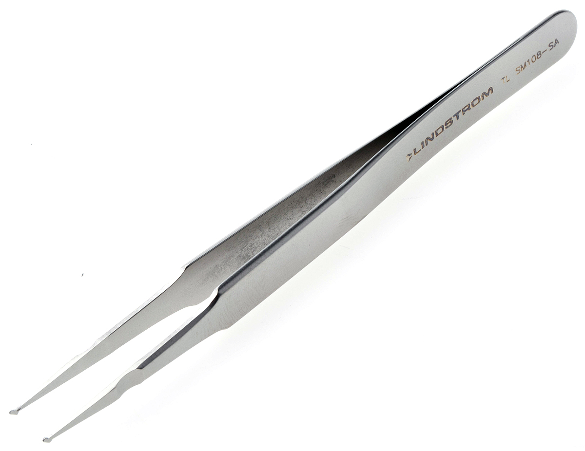This is 120 mm Stainless Steel Rounded ESD Tweezers manufactured by Lindstrom. The manufacturer part number is TL SM 108-SA. The tip is fine in size. The product is made from highly stable and reliable stainless steel. It has an overall length of 120 mm. In addition, it is anti-acid yes . It has an anti-magnetic characteristic yes . ESD Safety - yes. It has a/an rounded type point .