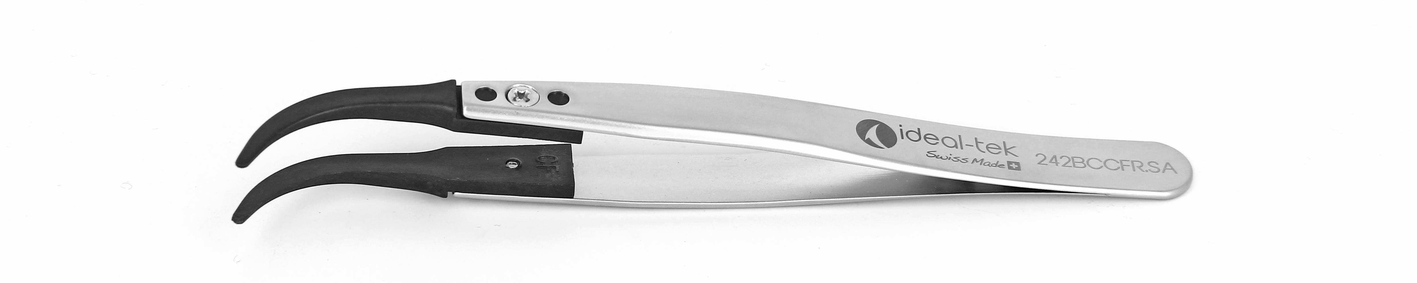 This is 115 mm Stainless Steel Curved ESD Tweezers manufactured by ideal-tek. The manufacturer part number is 242BCCFR.SA.1. The tip is 1.50 x 0.50 mm in size. The product has a curved orientation. The product is made from highly stable and reliable stainless steel. It has an overall length of 115 mm. It has a model number 242bccfr.sa.1. It has an anti-magnetic characteristic yes . ESD Safety - yes. It has a/an curved type point .