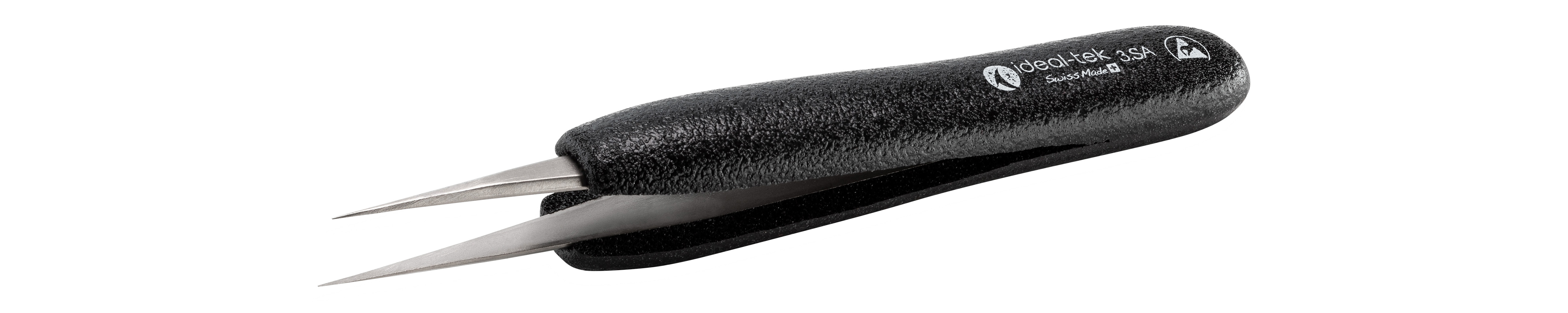 This is 130 mm Stainless Steel Straight ESD Tweezers manufactured by ideal-tek. The manufacturer part number is 3.SA.DN.6. The tip is 0.30 x 0.20 mm in size. The product has a straight orientation. The product is made from highly stable and reliable stainless steel. It has an overall length of 130 mm. It has a model number 3.sa.dn.6. It has an anti-magnetic characteristic yes . ESD Safety - yes. It has a/an straight type point .