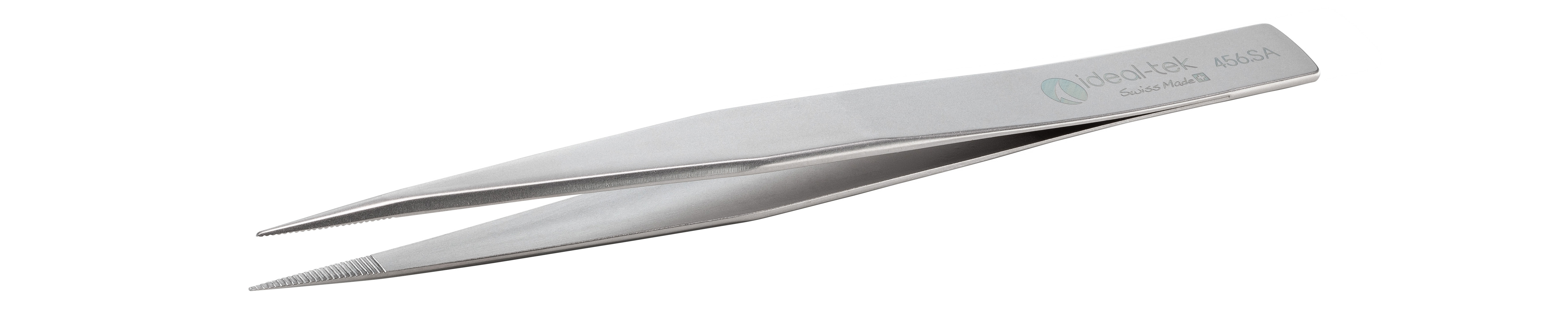 This is 125 mm Stainless Steel Straight Tweezers manufactured by ideal-tek. The manufacturer part number is 456.SA.2. The tip is 0.34 x 0.22 mm in size. The product has a straight orientation. The product is made from highly stable and reliable stainless steel. It has an overall length of 125 mm. It has a model number 456.sa.2. It has an anti-magnetic characteristic yes . ESD Safety - no. It has a/an straight type point .