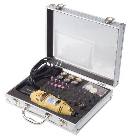 This is RC 230 EURO Corded Drill Kit Type F - Schuko plug manufactured by RS Pro. The manufacturer part number is 487-1367. The corded drill kit is designed to provide robust applications in a variety of specific settings. This versatile kit contents include miniature electric drill with 100 accessories for cutting; grinding; polishing; cleaning & engraving, robust carry case components. Moreover, the product has a nominal 230v voltage rating. This product carries 87w. The plug is a highly reliable type f - schuko plug with long service life. It has a model number rc 230 euro. It has a robust speed of 8000 → 25000rpm.