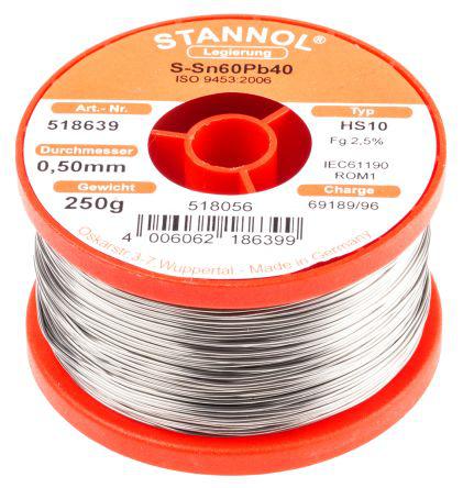 Stannol 0.5mm Wire Lead solder, +183°C Melting Point, 40% Lead, 60% Tin, 250g