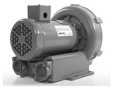 This is Regenerative Blower 254 x 245 x 299mm 115 V ac 230 V ac manufactured by Ametek. The manufacturer part number is DR202Y9M/080564. It has a standard 31.75mm outlet diameter . The given dimensions of the product include 254 x 245 x 299mm. It also carries 2.6 a, 5.2 a maximum current. It has an inlet diameter about 31.75mm . The given diameter of mounting hole is 10mm. It has about 83 mm, 206.2 mm horizontal hole spacing . It operates through ac. This has integrated with a ball, a bearing with long-lasting features. In addition, the height is 254mm. Furthermore, the product is 245mm wide. The product comes in 299mm depth. Features 115 v ac, 230 v ac supply voltage. The product is designed with a terminal termination. It has a/an regenerative type blower . The product also provides special features, such as inlet and outlet internal muffling, quiet operation within osha standards, ul & csa approved motor with permanently sealed ball bearings. Its direction of curve is in forward .