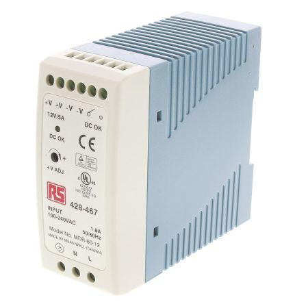 This is 60W Switch Mode DIN Rail Panel Mount Power Supply 12V dc/ 5A manufactured by RS Pro. The manufacturer part number is 428-467. The product has +70°c maximum temperature. It has a/an dc output voltage . The given dimensions of the product include 100 x 40 x 90mm. While its minimum temperature is -20°c. It has ac input voltage. It provides robust protection features, such as over voltage protection, overload protection, short circuit protection. Furthermore, the product is 40mm wide. The MTBF values include 299200h. Its output voltage (maximum) includes 15v dc. Its electrical phase configuration includes 1. The product is available in din rail configuration. It comes in switch mode configuration. Additionally, its holdup time is about 20 ms @ 115 v ac, 50 ms @ 230 v ac . Load Regulation - ±1%. The product complies with all safety standards, such as rohs compliant, tuv en 60950-1, ul 508, ul 60950-1. While its maximum input current includes 1 a @ 230 v ac, 1.8 a @ 115 v ac. It has 47 → 63hz input frequency range . It is a highly efficient product with an 86% of high efficiency. Its input voltage is 85 → 264v ac. Additionally, the product is supplied with 1 outputs. It has 12 → 15v of output voltage adjustment range. Has a line regulation of ±1%. Carries 120mv pk-pk ripple and noise. The product comes in 90mm depth. The product features 12v dc minimum output voltage. The product also provides special features, such as built-in dc ok active signal, cooling by free air convection, installed on din rail ts-35/7.5 or 15, led indicator for power on, universal ac input/full range, 3-years warranty, 100% full load burn-in test. It has a single phase input electrical phase . In addition, it has ac-dc type power signal conversion . The typical product's weight is 0.33kg. It carries 5 a output current. Features a 12 v dc output voltage. Feature 60w of power rating. 264v ac is the maximum voltage of the bespoke product. The product has 85v ac of minimum input voltage.