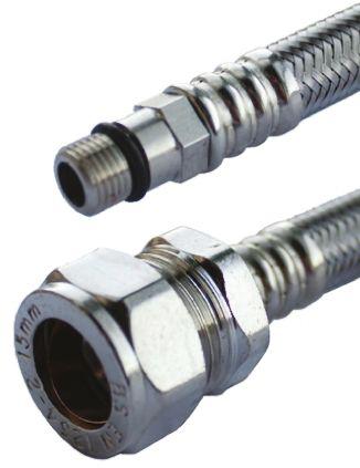 This is Braided Stainless Steel Hose manufactured by RS Pro. The manufacturer part number is 784-5276. Moreover, it has a 15 mm compression connection 1 . It has a standard 10 mm monoblock tap connection 2 . Furthermore, it is suitable for sanitary installation applications . brass is the connection material 1 of the product . With a 10mm connection size 2 . It has about 15mm connection size 1 .
