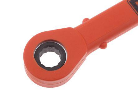 This is 7/16 in Insulated Ring Spanner 211 mm length manufactured by RS Pro. The manufacturer part number is 911-1345. VDE/1000V Approval Options - yes. A quality product with a nice insulated finish. The product is made from highly stable and reliable chrome vanadium steel. It has an overall length of 211 mm. It is double ended no . The product is available in 7/16 in size.